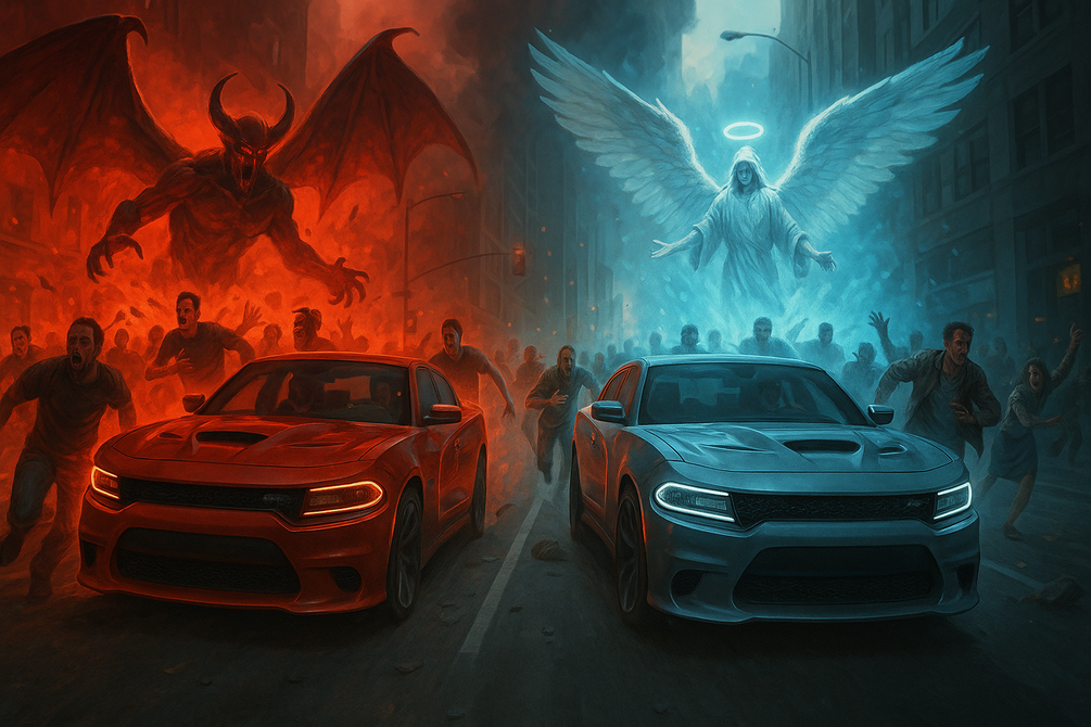 Step into a world where light and darkness collide — "Devil vs Angels – Dodge Charger" is a bold visual series that captures the eternal battle between good and evil, embodied in the powerful presence of the iconic Dodge Charger. With fiery reds, divine whites, and dramatic contrasts, each image tells a story of inner conflict, temptation, and redemption. This is more than a car — it’s a symbol of duality, raw power, and the choices we face. Perfect for collectors who appreciate adrenaline, symbolism, and muscle car mystique.
